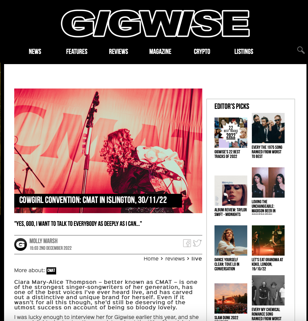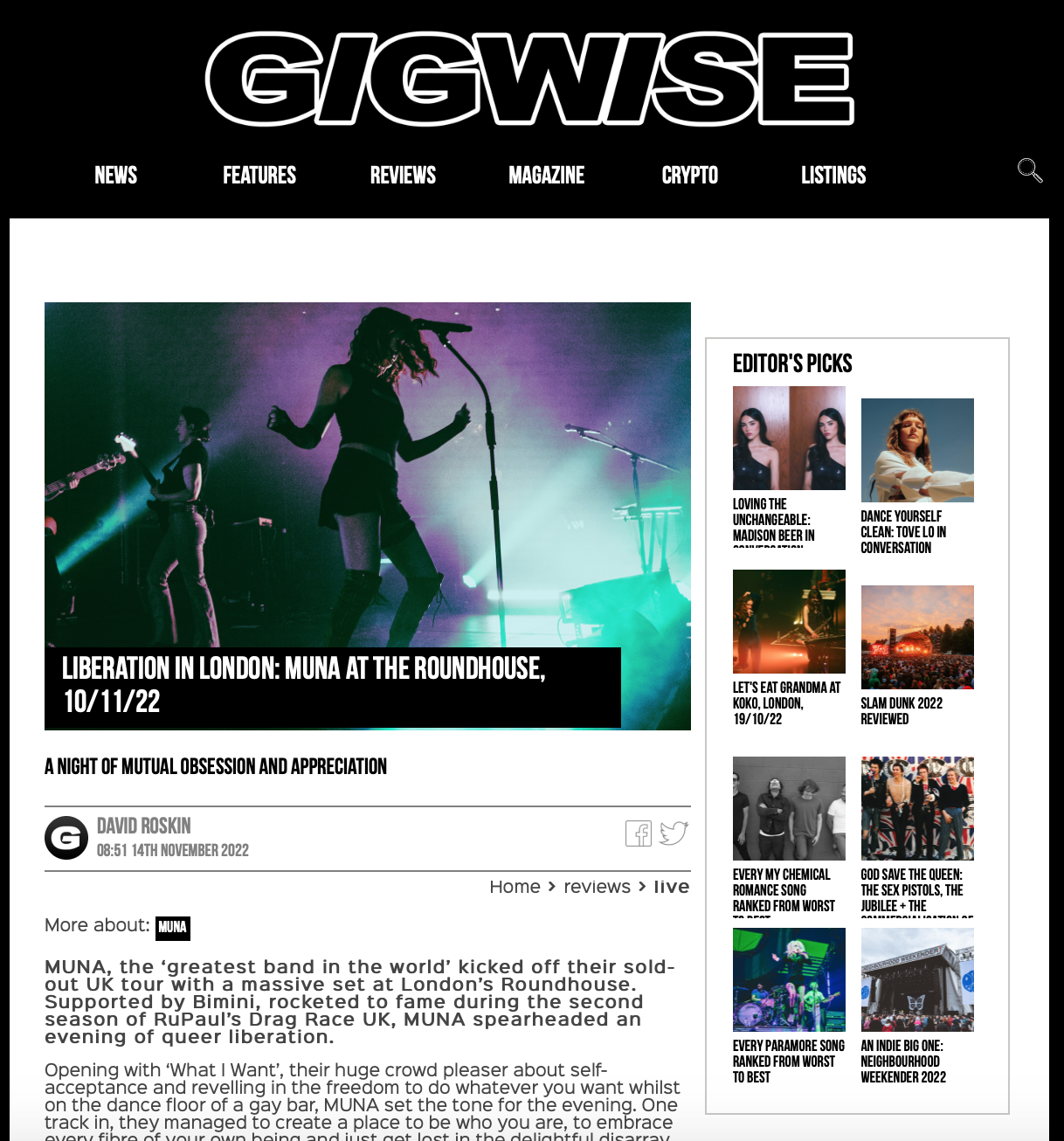 Photos of MUNA, CMAT for Gigwise, both also featured in their 22 Best Live Acts of 2022 piece. Other artists shot for Gigwise: Self Esteem, The Big Moon and the Isle of Wight Festival 2023.