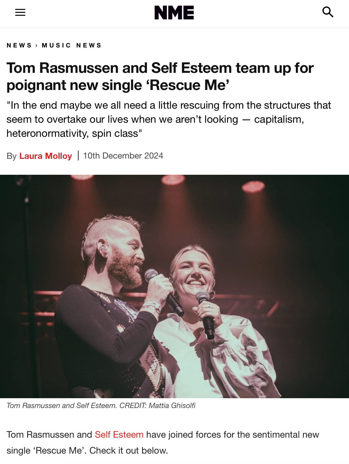 Images of Tom Rasmussen and Self Esteem featured in the NME and Dork. October 2024.